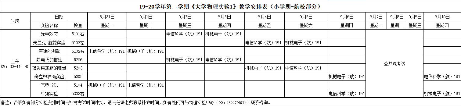 各班如有部分实验安排时间与补考考试时间冲突,请与任课老师联系补做时间,如有疑问也可与物理实验中心(QQ:568278912)联系咨询。