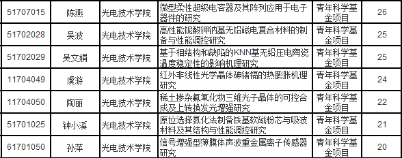 2017年度国家自然科学基金项目评审结果公布,截止8月17日,光电技术学院获得7项立项资助,直接经费达163万元,立项数居学校前列。按项目类型统计,7项国家自然科学基金项目全部为青年项目。