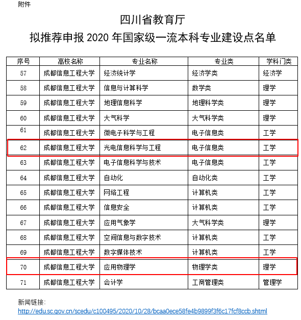 近日,四川省公布入选2020年度一流本科专业建设点名单,学院应用物理学专业入选,并被择优推荐申报本年度国家一流本科专业建设点。今年是国家实施“双万计划”的第二年,四川省地方高校共推荐311个专业申报2020年国家级一流本科专业建设点。其中,本年度新增推荐申报国家级一流本科专业建设点68个,加上2019年度第一批243个直接推荐国家级的省级一流本科专业建设点,共311个推荐专业。
