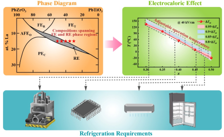 铁电相变被视为开发高性能电卡材料从而实现零排放全固态制冷技术的有效途径。然而,当前电卡研究多聚焦于室温附近大电卡效应铁电材料的研发,难以满足多样化制冷应用需求。本文基于(PbLa)(ZrTi)O3固溶体的室温相图,设计制备了Pb0.775La0.15ZrxTi1-xO3系列块状陶瓷,组分覆盖了铁电与弛豫铁电相区。通过精确调节Zr/Ti比例,成功在150°C至-45°C的宽温度区间内实现了电卡效应的有效调控,满足了从大型工业设备制冷到冰箱等多种制冷应用需求。此研究不仅凸显了拓宽电卡制冷应用领域的重要性,还提出了一种材料设计策略,以应对制冷技术日益增长的多样化挑战。