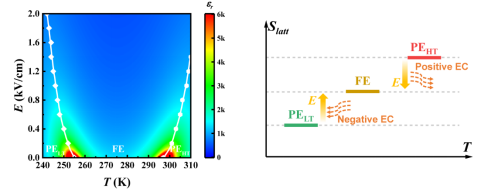 兼具正、负电卡效应的铁电材料在实现高效固态制冷方面展现出巨大潜力,而相变则被认为是设计这类材料的关键。本文采用朗道热力学理论,深入探究了罗息盐单晶的电卡行为及其与相变之间的关联。通过自由能密度、铁电和介电数据的分析,揭示了罗息盐单晶中存在复杂热致相变次序(顺电相-铁电相-顺电相)。这赋予了罗息盐单晶独特的场致相变行为和电卡响应。在高温和低温居里点附近,分别观察到了显著的正电卡效应和负电卡效应。两个顺电相与铁电相之间熵变的相反符号,被确定为导致电卡响应差异的根本原因。本文不仅深化了对电卡效应的理解,还为设计兼具正、负电卡效应的材料提供了思路。